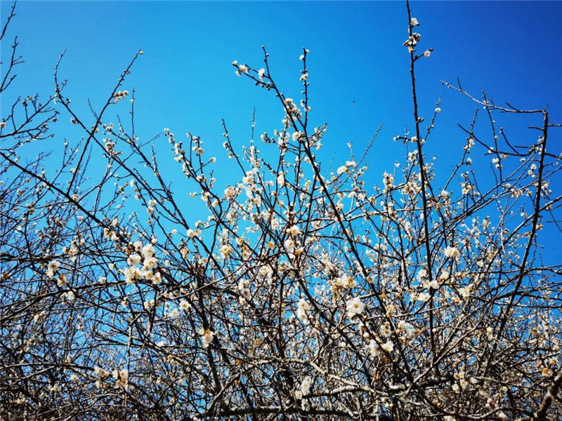 八寨溝梅園四周青山環(huán)繞,鳥語(yǔ)花香,當(dāng)梅花盛開時(shí),漫山遍野的梅花與青山綠水交相輝映,宛如世外桃源;當(dāng)你置身其中,極目望去,朵朵梅花在艷陽(yáng)冷風(fēng)中傲然綻放;遠(yuǎn)望,一樹繁花似錦如雪,近賞,朵朵白梅挺立枝頭,小巧的花瓣,精致的花蕊,潔白無(wú)瑕,成群的蜜蜂在花間縈繞。