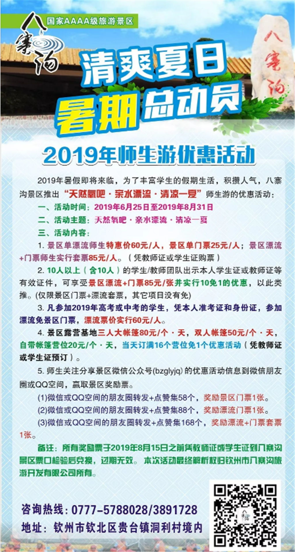 2019 年暑期將至,八寨溝景區(qū)推出暑期系列票價(jià)優(yōu)惠政策, 師生群體可享受景區(qū)門票半價(jià), 八寨溝森林漂流特惠價(jià), 關(guān)注景區(qū)微信公眾號(hào)并轉(zhuǎn)發(fā)朋友圈集贊, 贏取八寨溝景區(qū)門 票和森林漂流票等系列優(yōu)惠活動(dòng)。