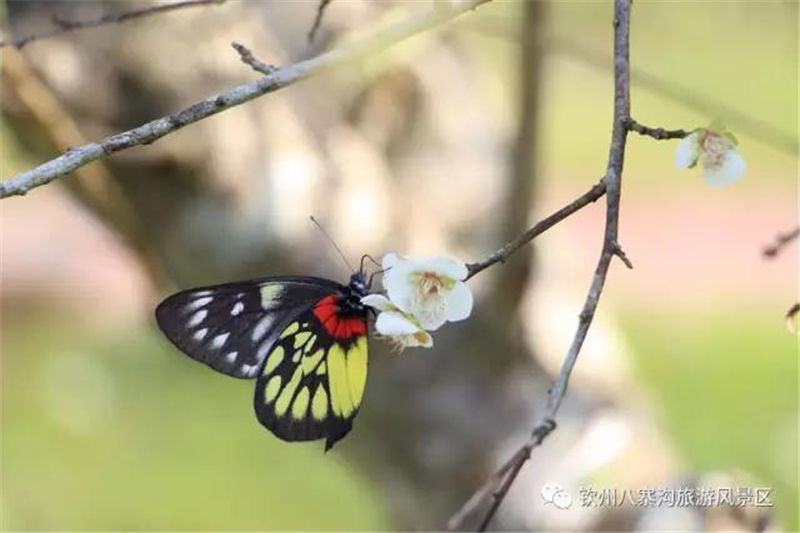 濃郁的花香吸引了眾多游客,在盛放的梅樹前擺出各種造型拍照,也引來了不少蝴蝶,在枝頭飛舞縈繞。