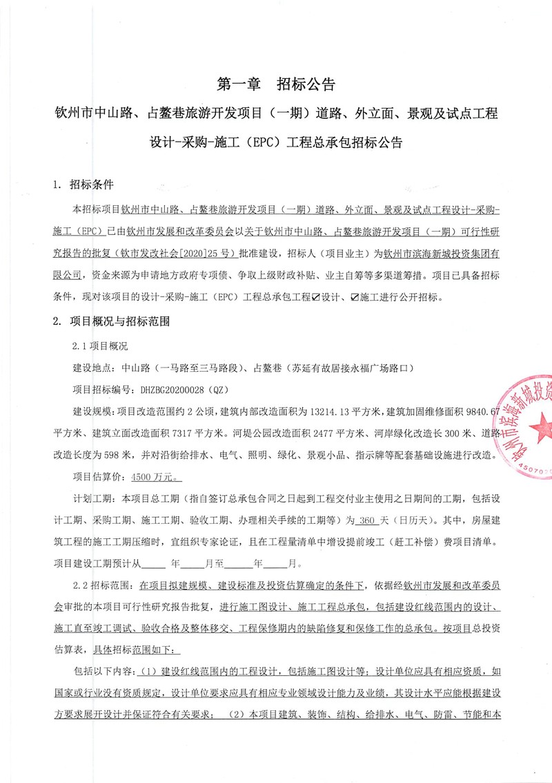 欽州市中山路、占鰲巷旅游開發(fā)項目(一期)道路、外立面、景觀及試點工程設(shè)計-采購-施工(EPC)工程總承包招標公告