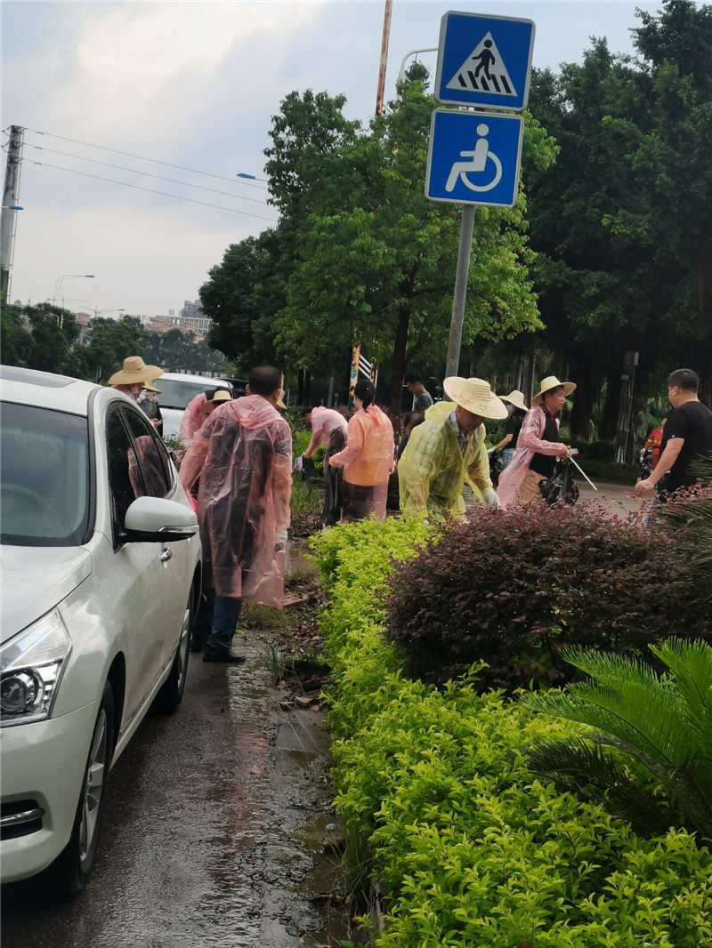 活動當(dāng)天,煙雨朦朧。志愿者們有的拿著鏟子,有的拿著掃把,有的拿著垃圾簍,冒雨干起活來。
