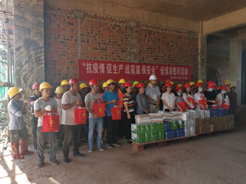 7月13日,欽州市總工會(huì)調(diào)研員黃春雯等一行到我集團(tuán)公司負(fù)責(zé)建設(shè)的欽州是茅尾海監(jiān)控監(jiān)測管理基地項(xiàng)目現(xiàn)場,開展“抗疫情 促生產(chǎn) 戰(zhàn)高溫”送清涼慰問活動(dòng)。在炎炎夏日,為現(xiàn)場辛勤勞作的農(nóng)民工獻(xiàn)上一份清涼。致謝每一位在一線工作的人員,感謝他們?yōu)槲覀兂鞘邪l(fā)展貢獻(xiàn)一份力量。