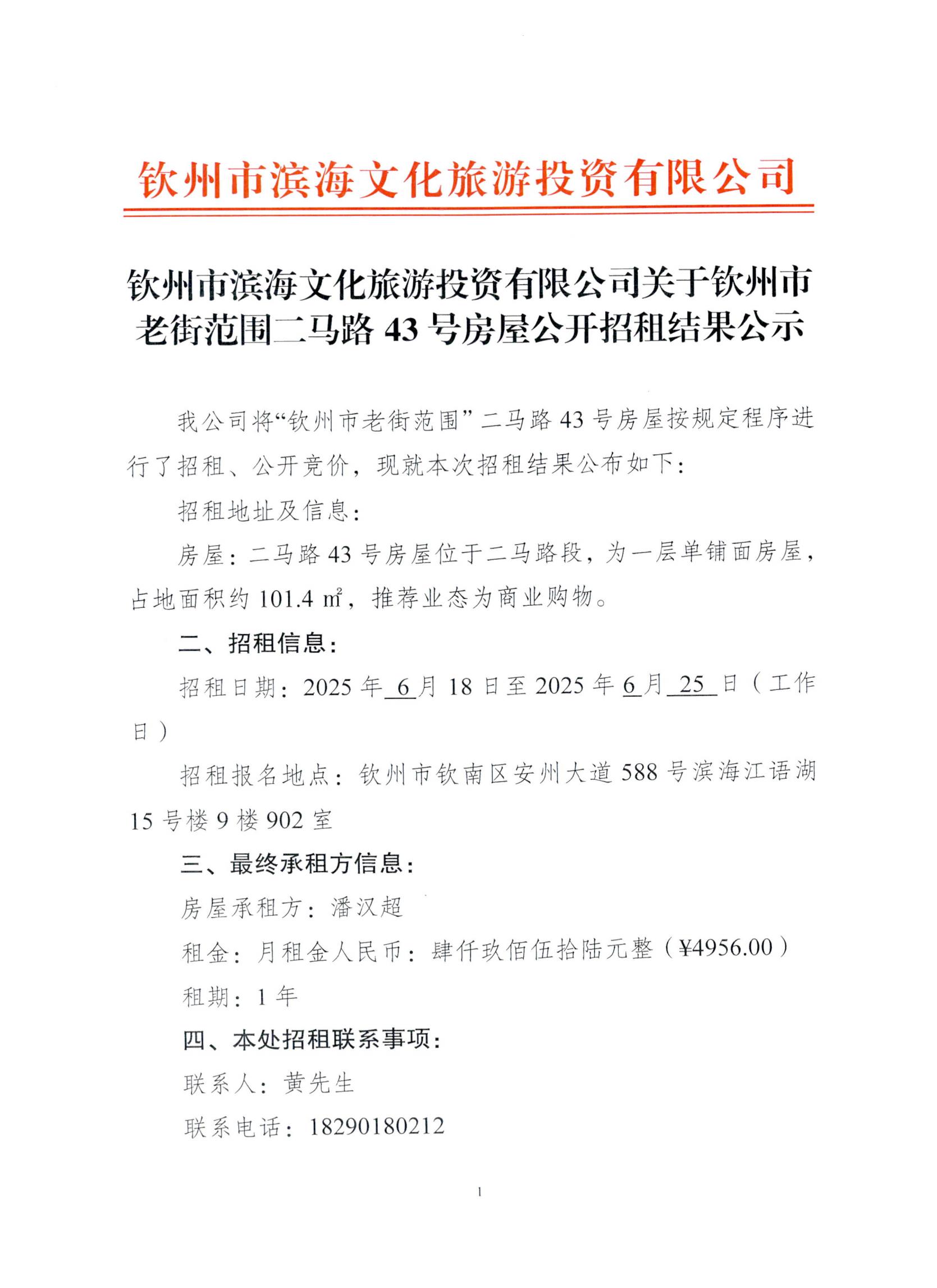 欽州市濱海文化旅游投資有限公司關(guān)于欽州市老街范圍二馬路43號(hào)房屋公開(kāi)招租結(jié)果公示