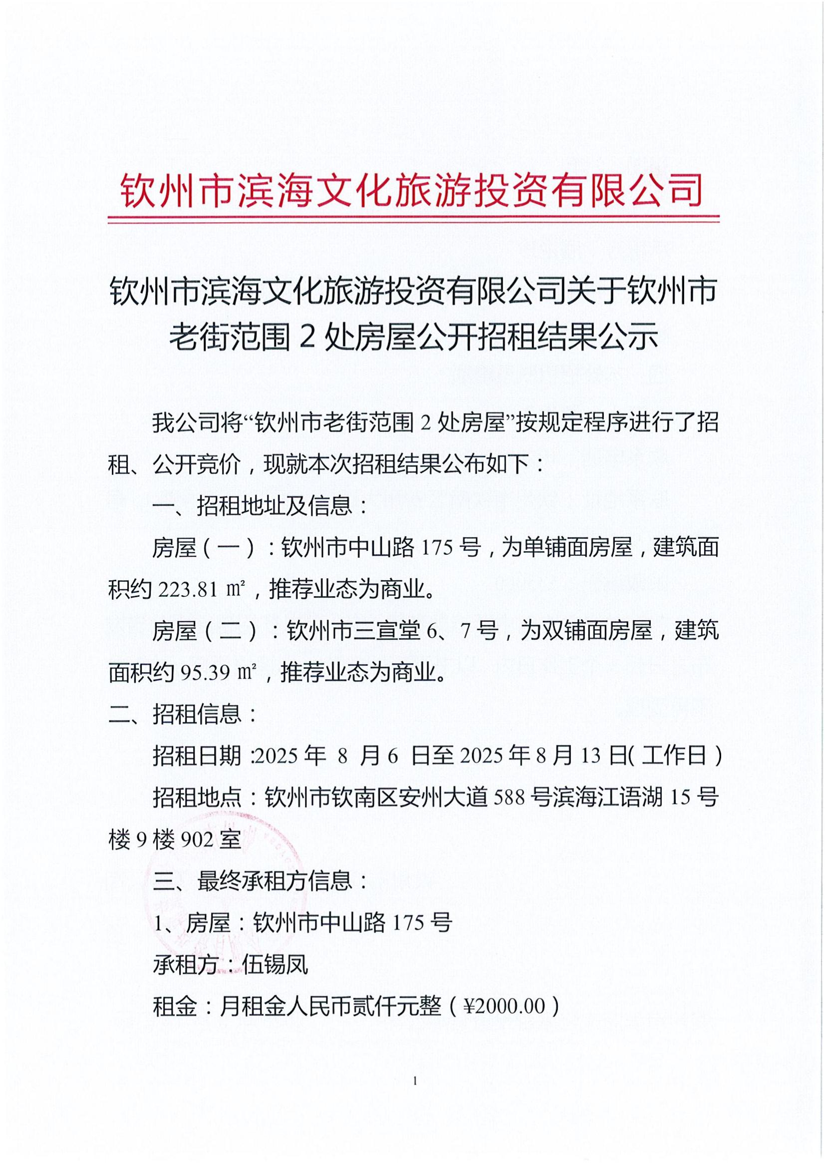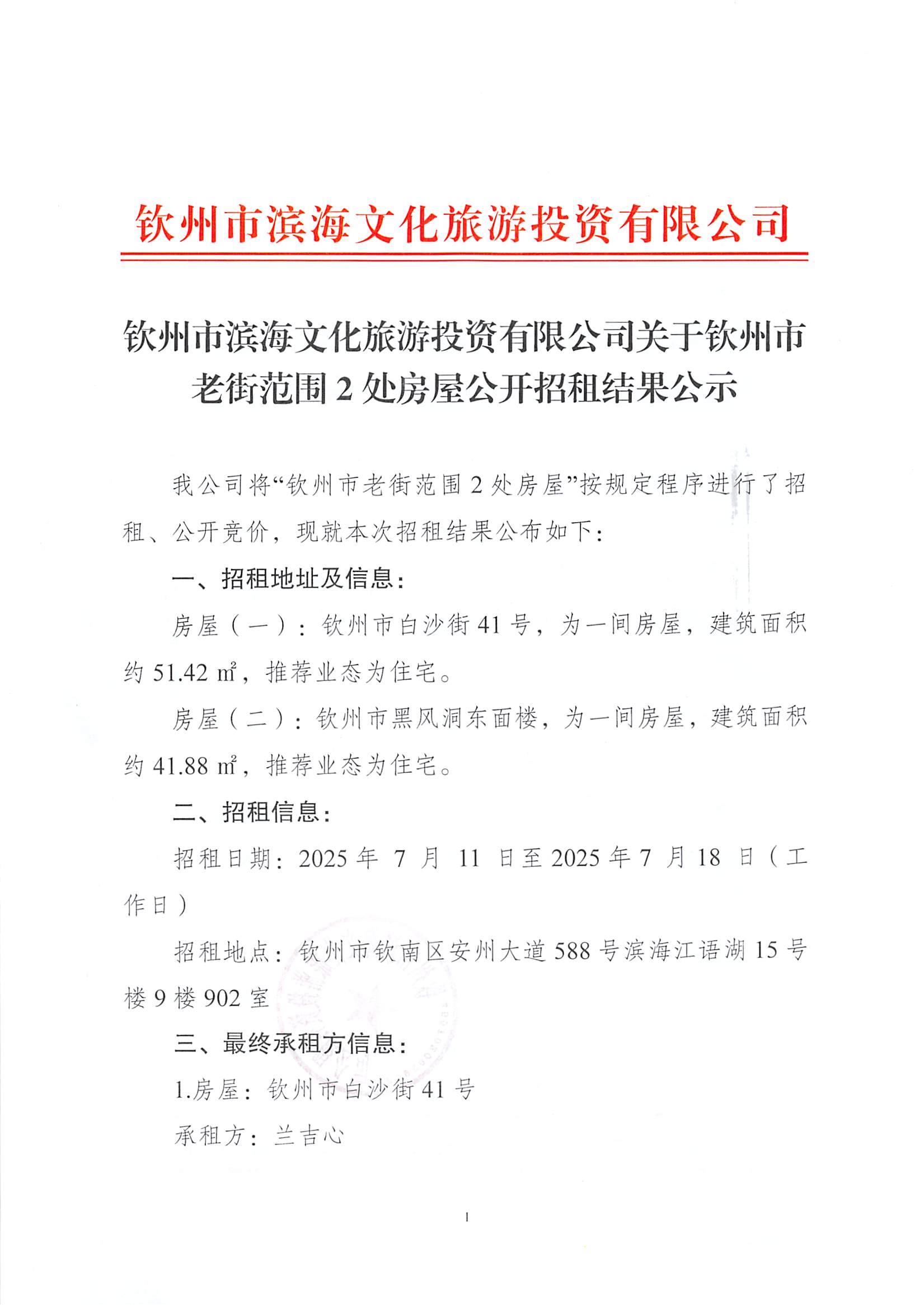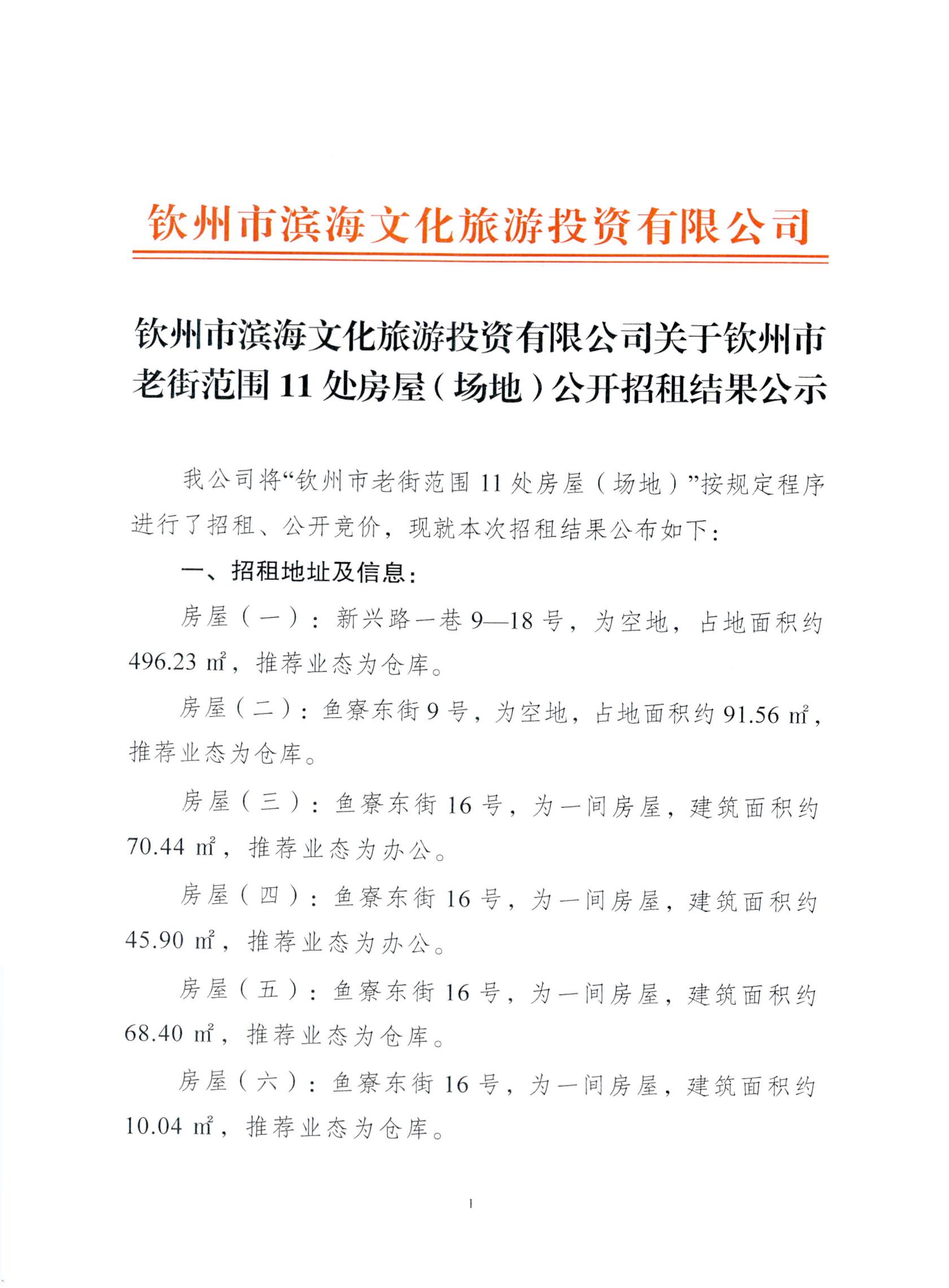 欽州市濱海文化旅游投資有限公司關(guān)于欽州市老街范圍2處房屋公開(kāi)招租結(jié)果公示