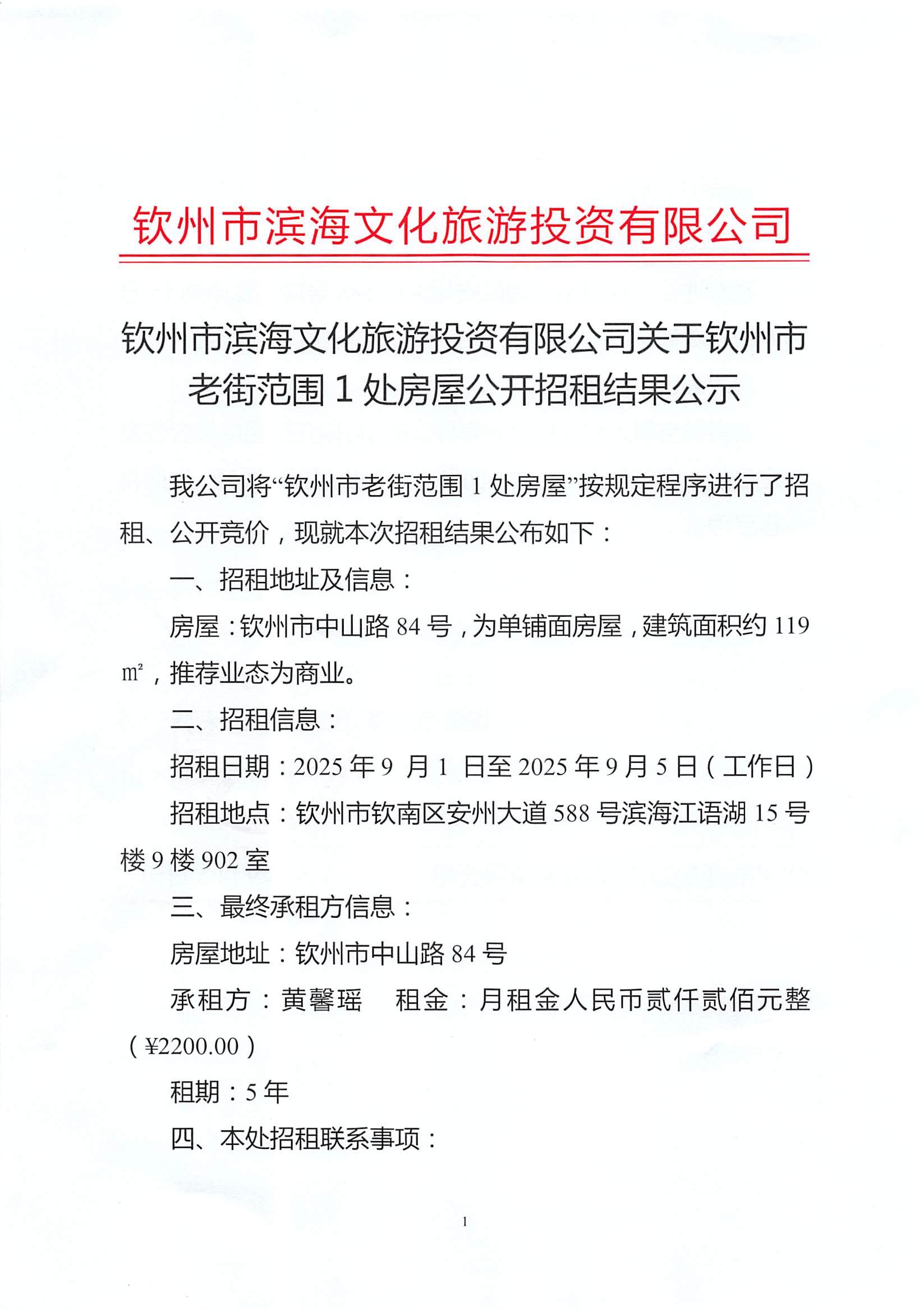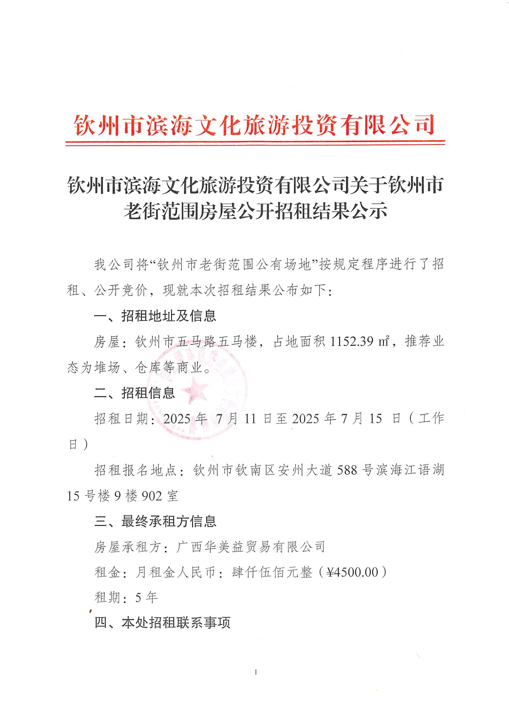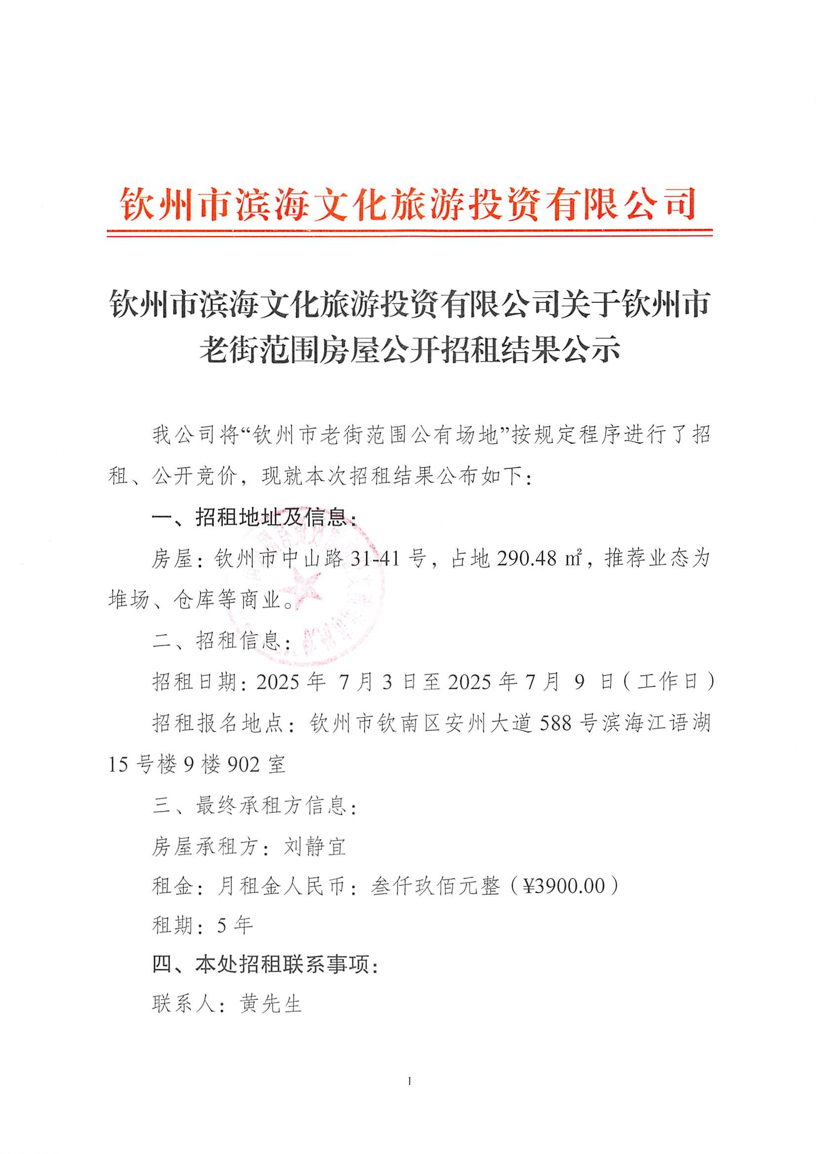 欽州市濱海文化旅游投資有限公司關(guān)于欽州市老街范圍1處房屋公開(kāi)招租結(jié)果公示