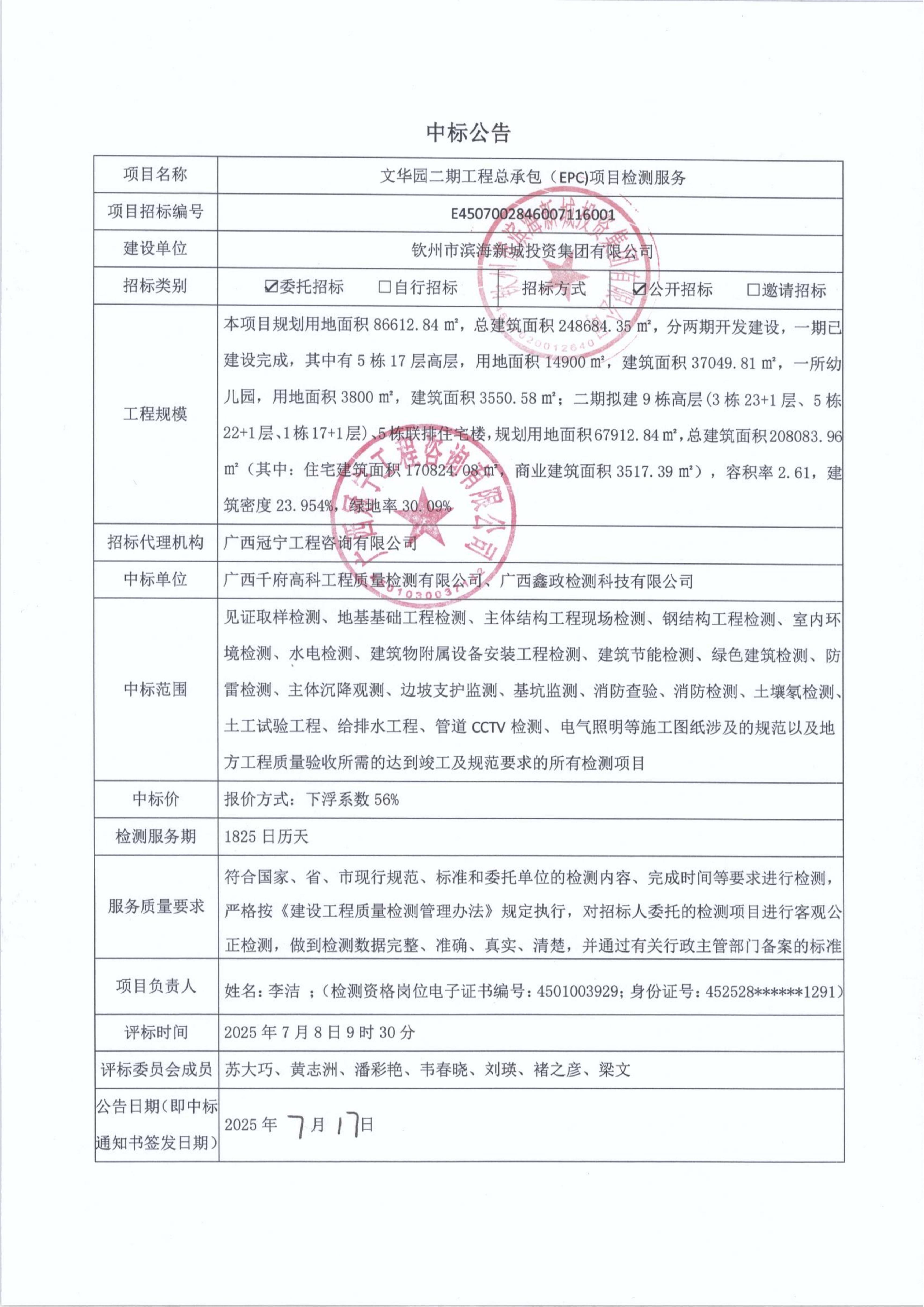 文華園二期工程總承包(EPC)項(xiàng)目檢測(cè)服務(wù)中標(biāo)公告