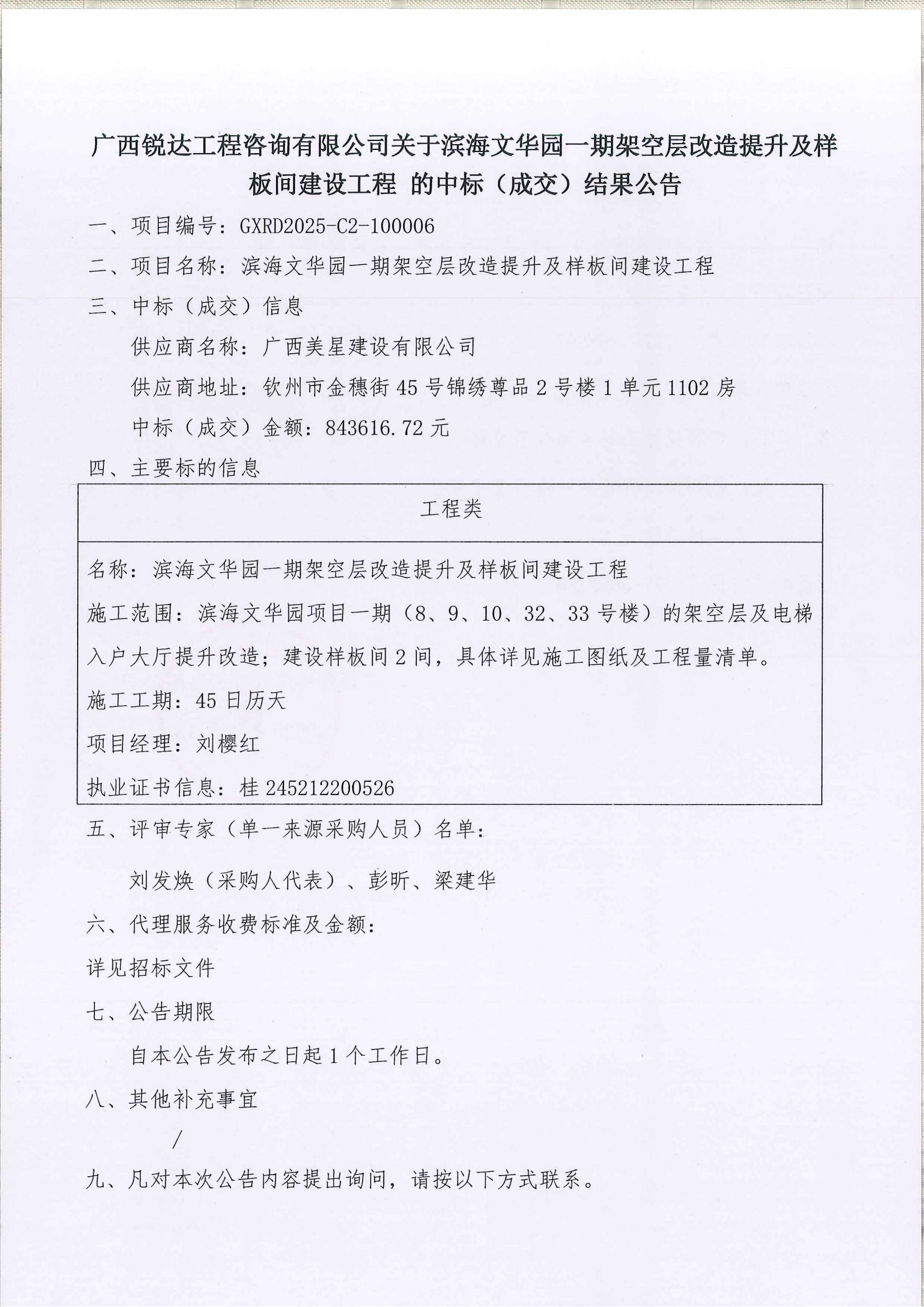 廣西銳達(dá)工程咨詢有限公司關(guān)于濱海文華園一期架空層改造提升及樣板間建設(shè)工程的中標(biāo)(成交)結(jié)果公告