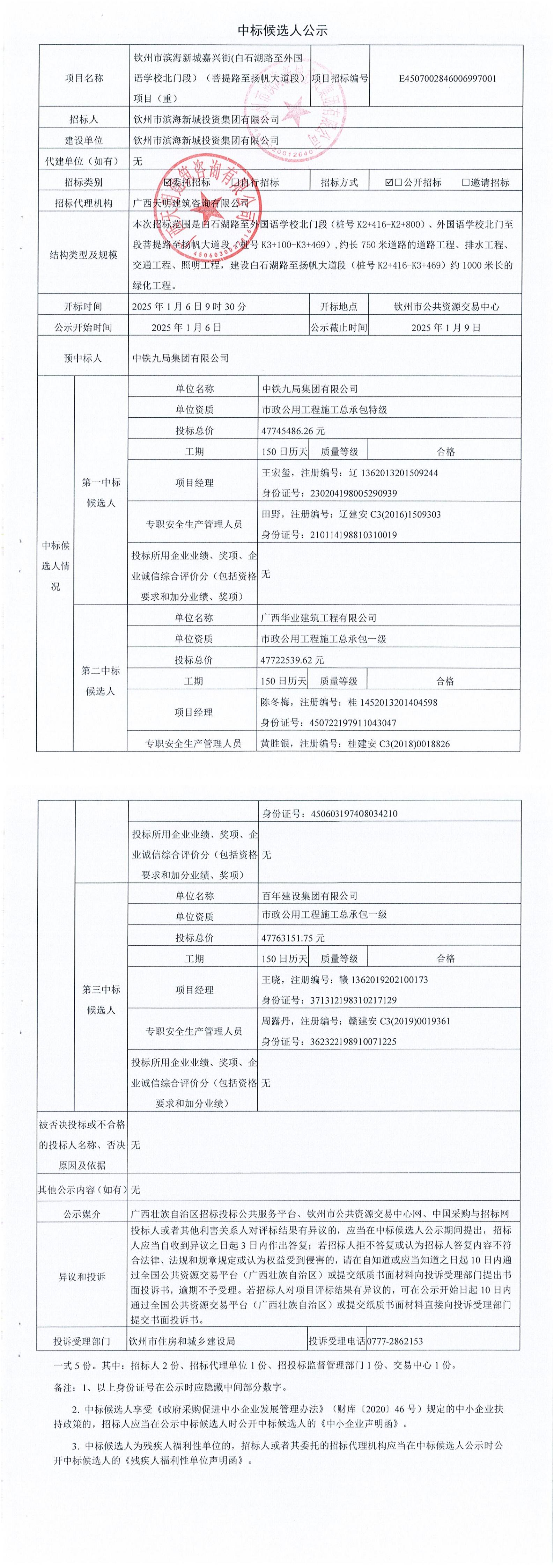 欽州市濱海新城嘉興街(白石湖路至外國語學(xué)校北門段)(菩提路至揚(yáng)帆大道段)項(xiàng)目(重)中標(biāo)候選人公示