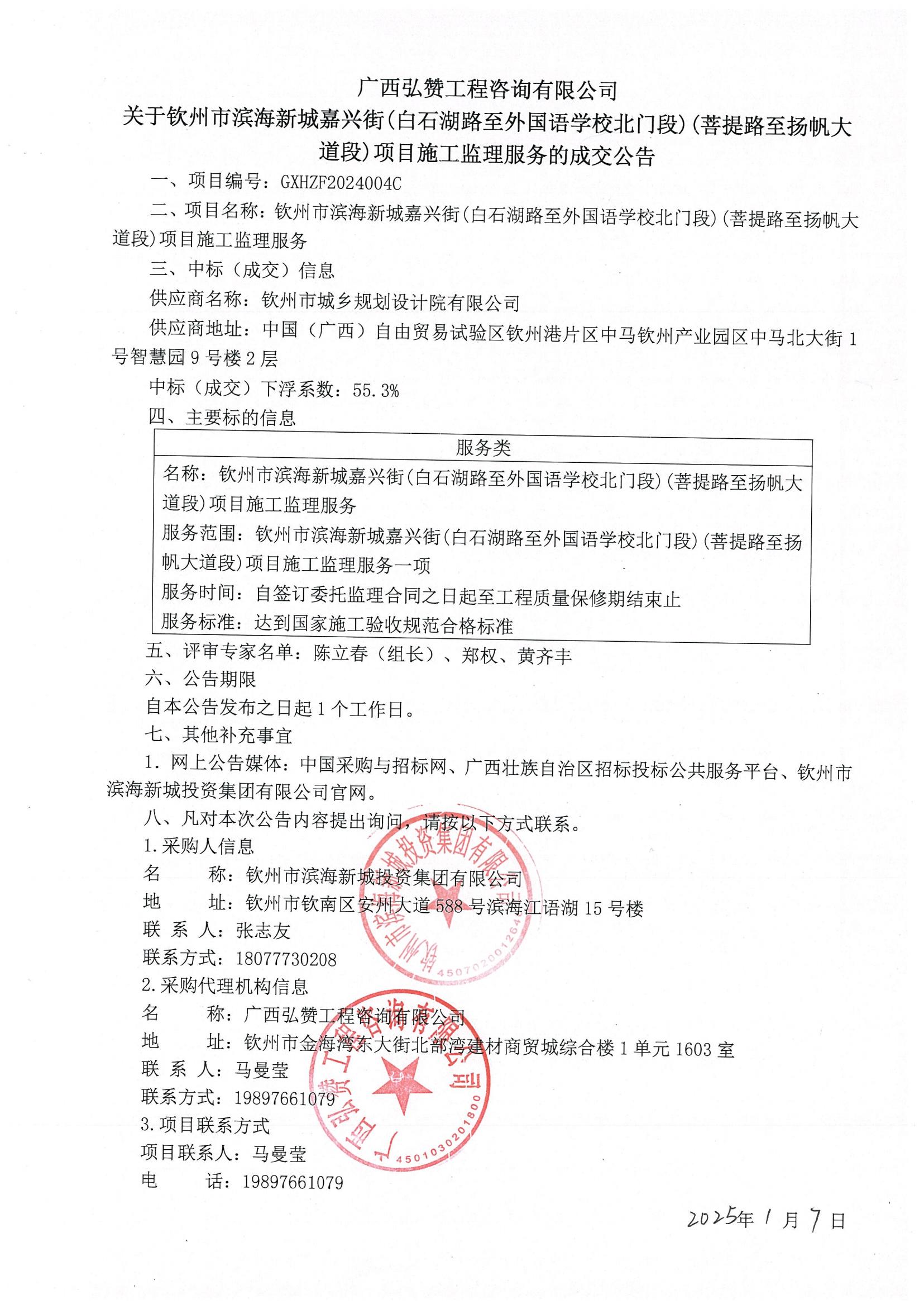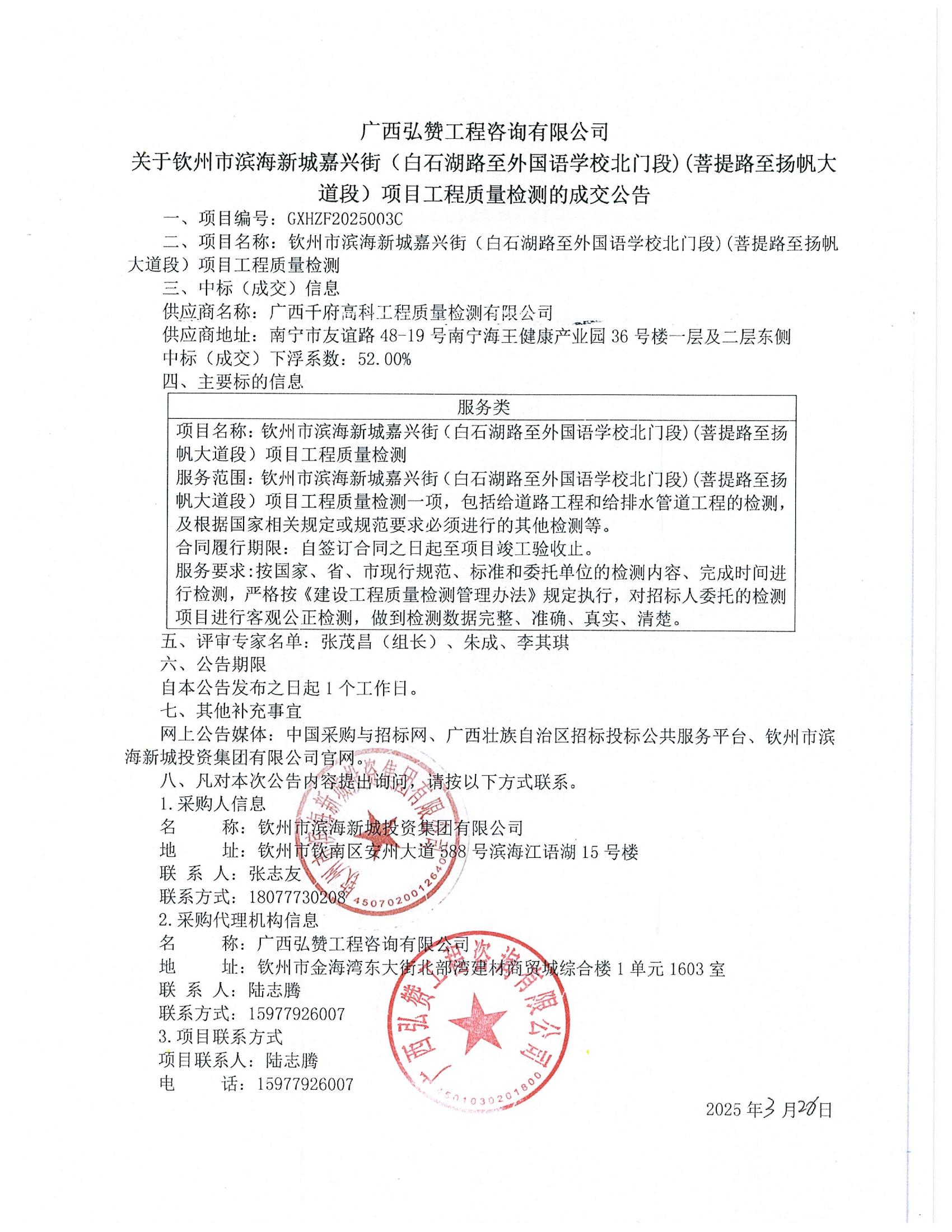 欽州市濱海新城嘉興街(白石湖路至外國語學(xué)校北門段)(菩提路至揚(yáng)帆大道段)項(xiàng)目工程質(zhì)量檢測的成交公告