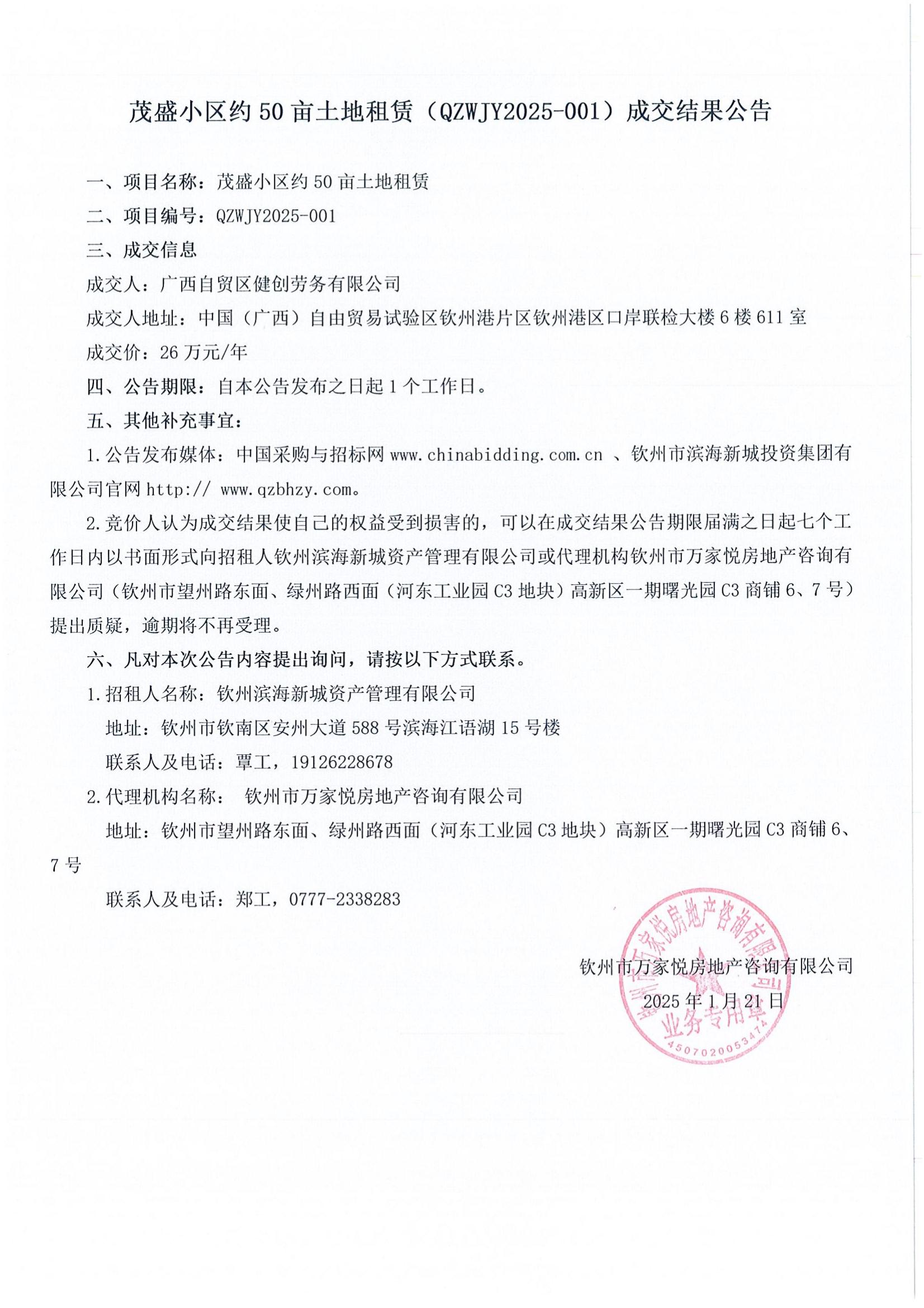 茂盛小區(qū)約50畝土地租賃(QZWJY2025-001)成交結(jié)果公告