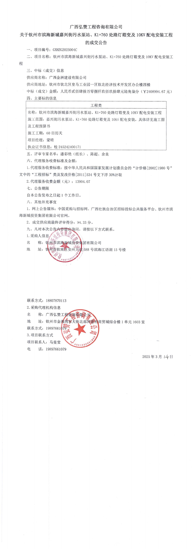 成交公告-欽州市濱海新城嘉興街污水泵站、K1+760處路燈箱變及10KV配電安裝工程