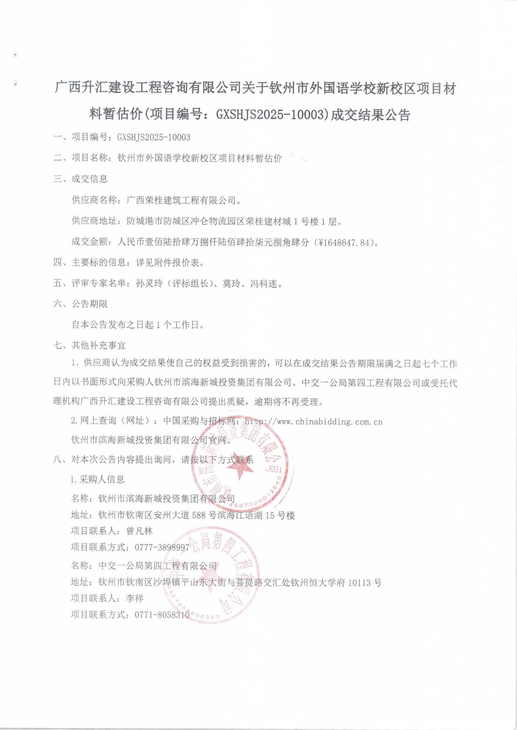 成交結(jié)果公告(欽州市外國語學(xué)校新校區(qū)項(xiàng)目材料暫估價)