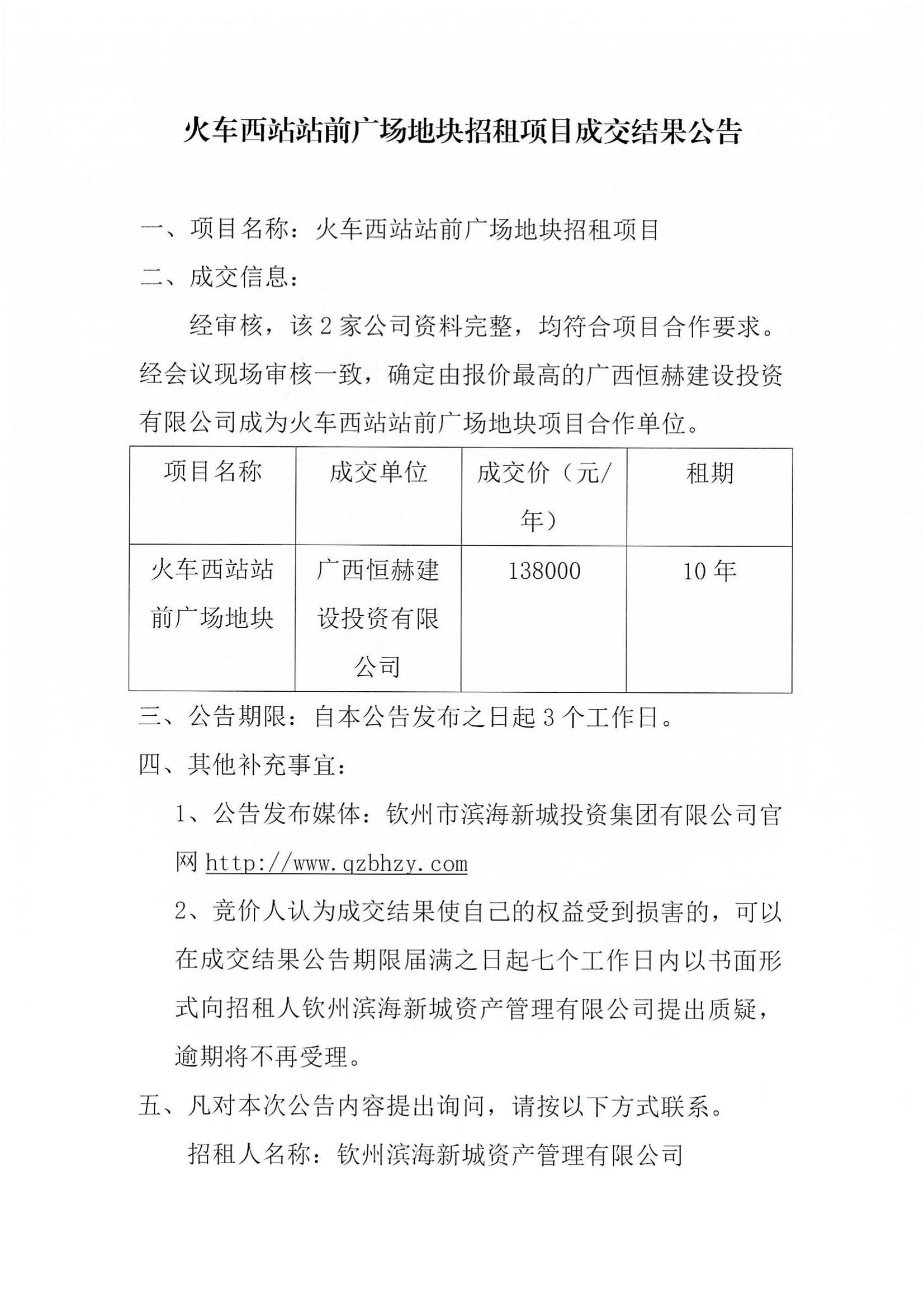 火車西站站前廣場地塊招租項(xiàng)目成交結(jié)果公告
