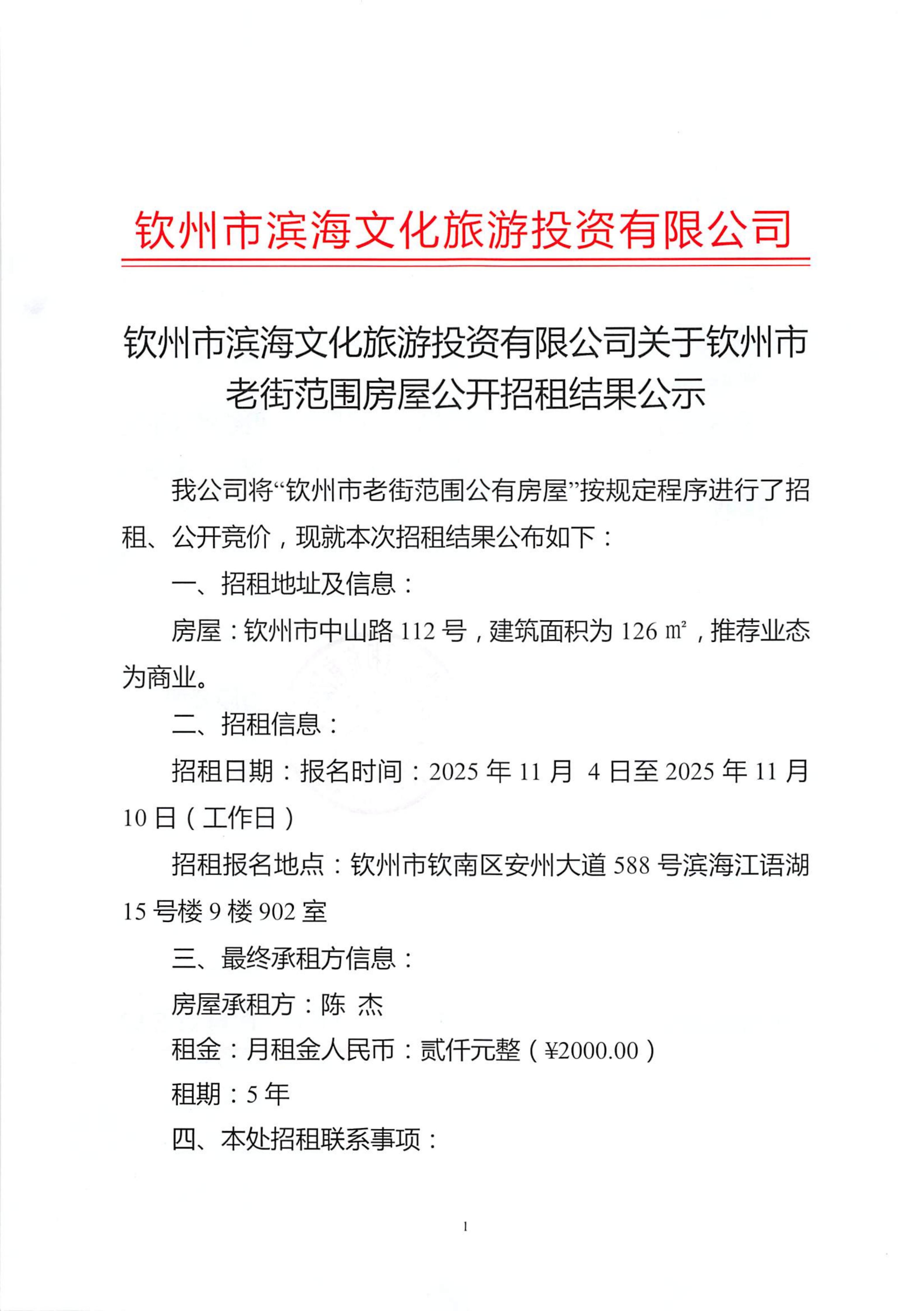 欽州市濱海文化旅游投資有限公司關(guān)于欽州市老街范圍房屋公開招租結(jié)果公示(欽州市中山路112號(hào))