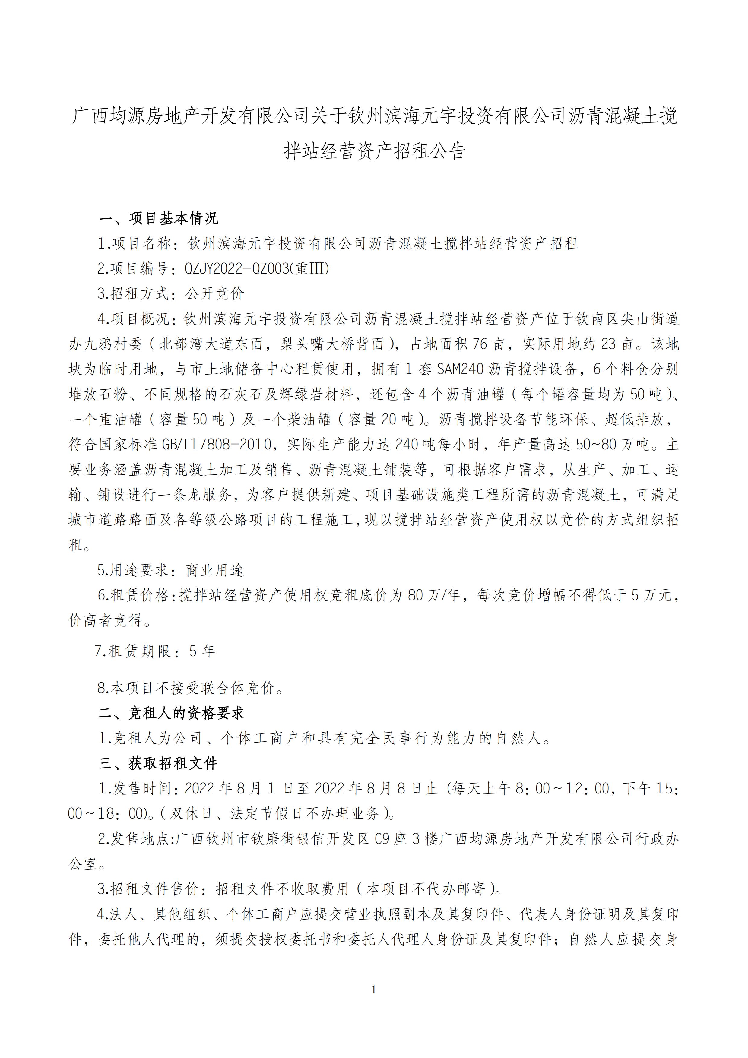 廣西均源房地產(chǎn)開發(fā)有限公司關于欽州濱海元宇投資有限公司瀝青混凝土攪拌站經(jīng)營資產(chǎn)招租公告