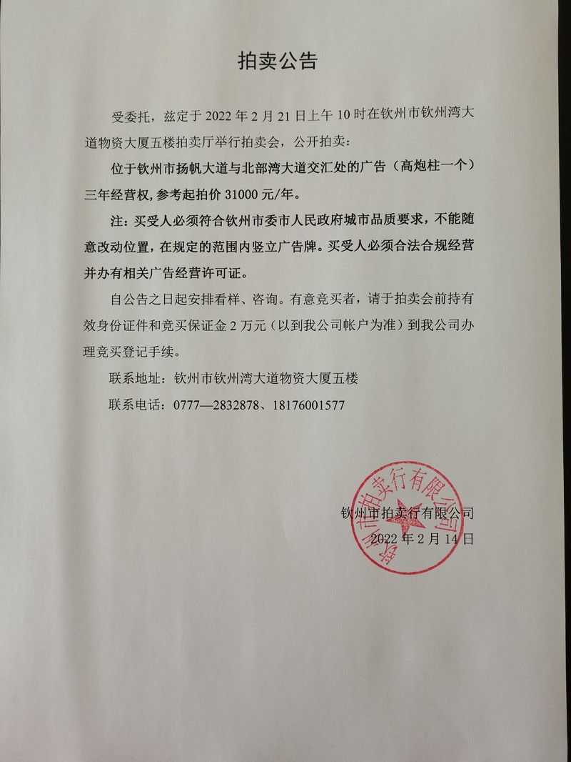 拍賣公告(揚帆大道與北部灣大道交匯處廣告經(jīng)營權(quán))
