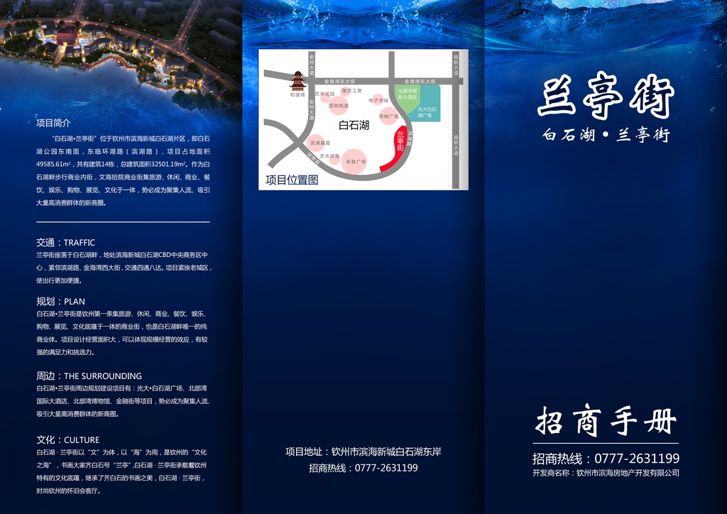 白石湖蘭亭街項(xiàng)目坐落于欽州濱海新城白石湖畔,毗鄰光大商圈,由風(fēng)格獨(dú)特的獨(dú)立式建筑群組成。項(xiàng)目占地面積49585.61㎡,總建筑面積32501.19㎡,地下停車場300多個(gè)停車位。作為白石湖畔步行商業(yè)內(nèi)街,蘭亭街集旅游、休閑、商業(yè)、餐飲、娛樂、購物、展覽、文化于一體,勢必成為聚集人流、吸引大量高消費(fèi)群體的商圈。