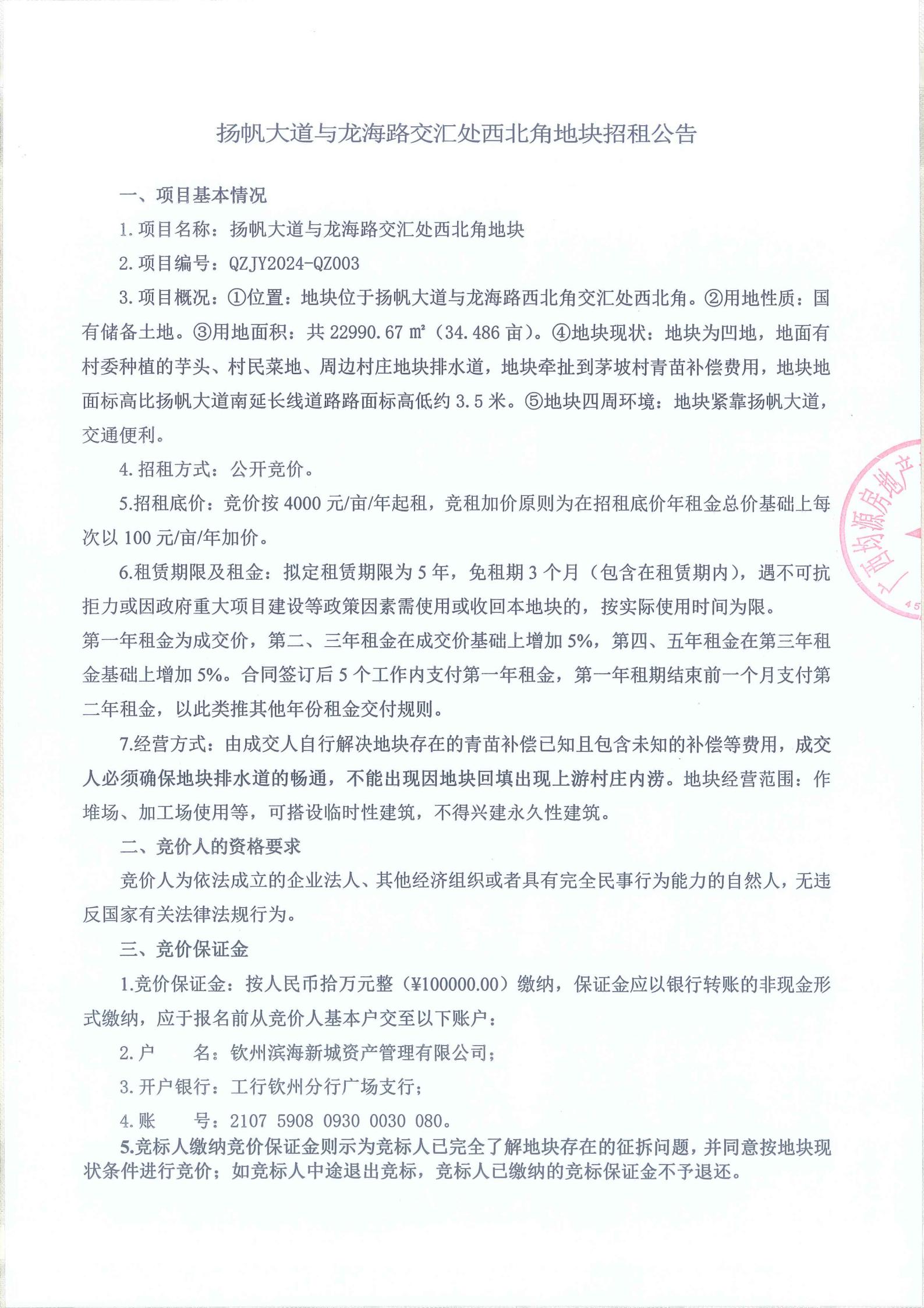 揚帆大道與龍海路交匯處西北角地塊招租公告
